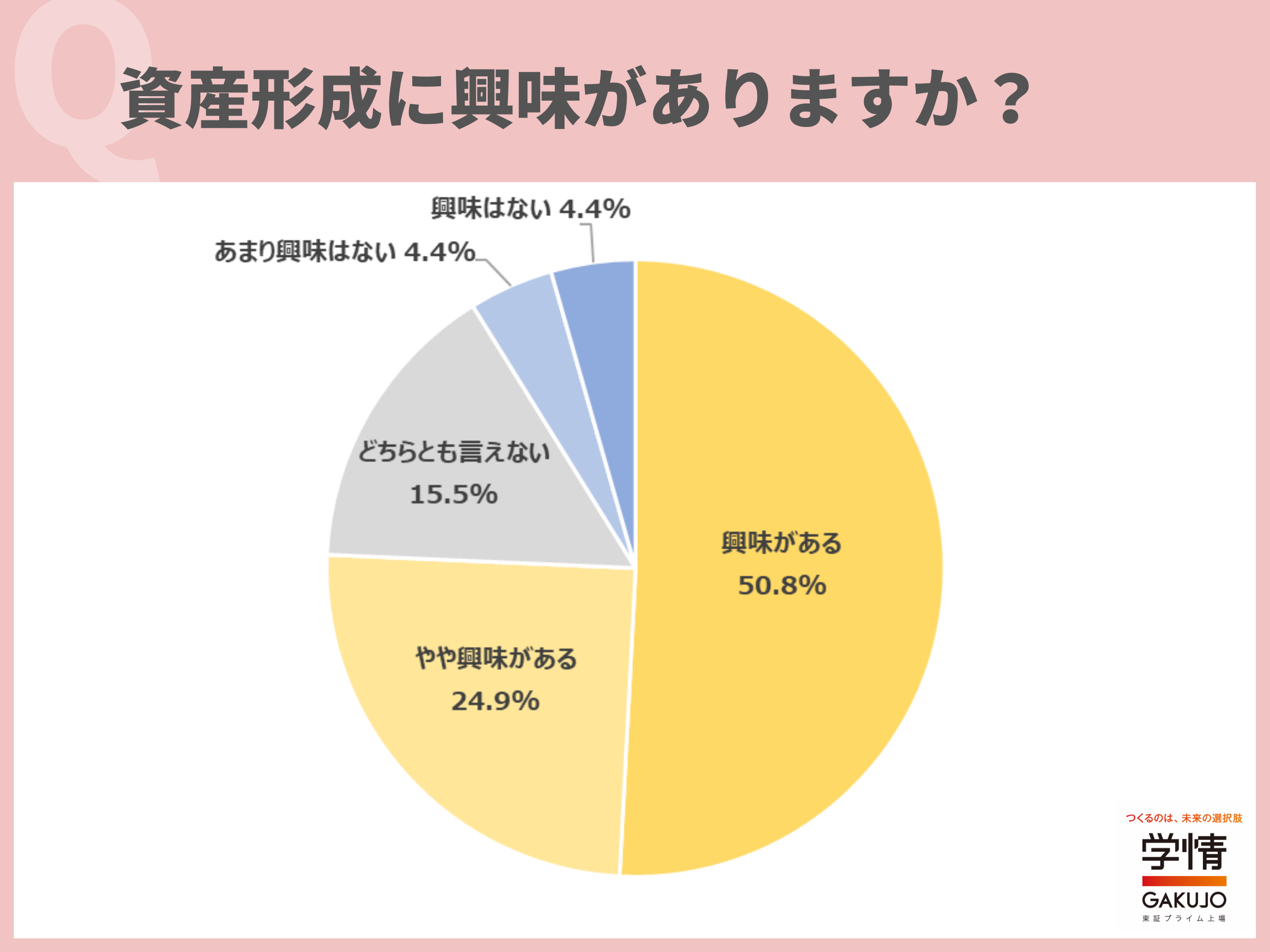 「資産形成」に「興味がある」と回答した20代が50.8%に上りました。「やや興味がある」24.9%を合わせると、7割以上の20代が「資産形成」に興味を持っていることが分かります。「銀行口座に預金しておくよりも、資産を増やすことができる」「預金に入れておくだけでは、お金の価値が目減りしてしまう」「お金にも働いてもらいたい」「20代のうちに始めることが大切だと思う」「老後の年金に不安がある」といった声が寄せられました。