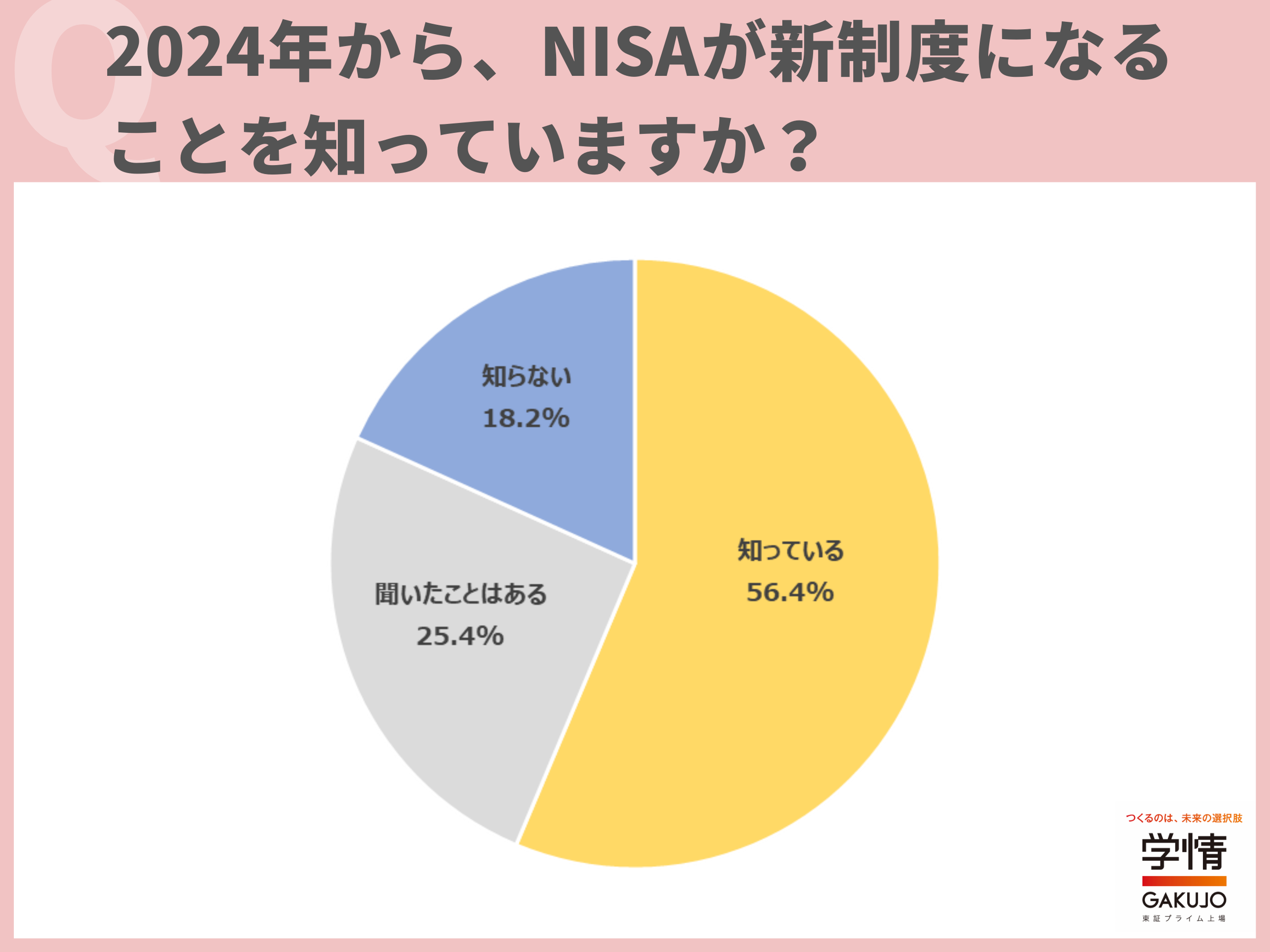2024年から、NISAが新制度になることについて、「知っている」と回答した20代は56.4%でした。「聞いたことはある」25.4%を合わせると、認知率は8割を超えます。