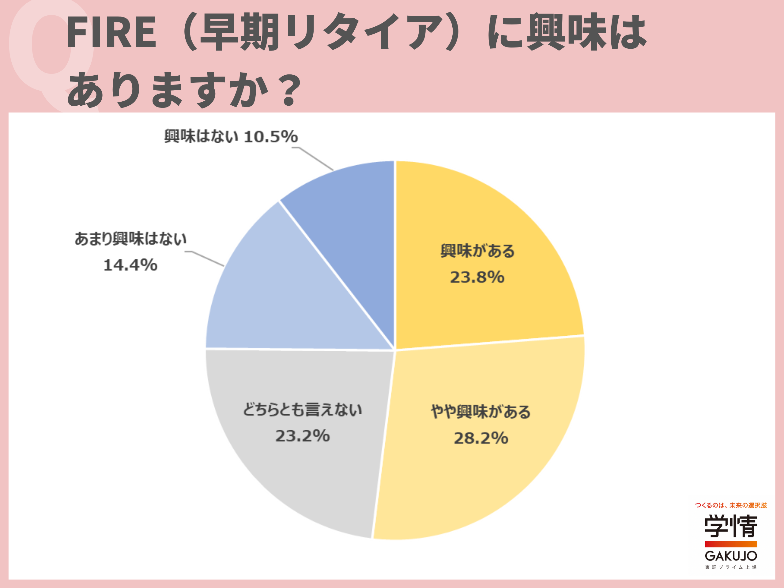 「FIRE(早期リタイア)」に「興味がある」と回答した20代が23.8%に上りました。「やや興味がある」28.2%を合わせると、半数以上の20代が「FIRE」に興味があるとしています。「1つの選択肢だと思う」「早期リタイアよりは、柔軟な働き方で仕事を続けながら自由に生活するセミリタイアに興味がある」といった声が寄せられました。