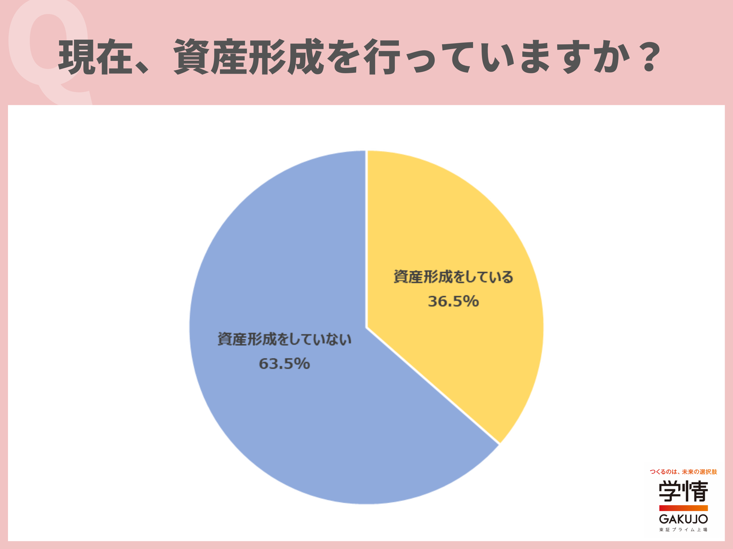 現在、「資産形成をしている」と回答した20代は36.5 %でした。「資産形成をしていない」の回答は63.5%となっています。「興味はあるものの、実際に投資はしていない」「リスクも伴うので、きちんと情報収集をしてから始めたい」「どのように資産形成をするのが良いか分からない」といった声が上がっています。