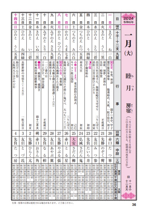 行事、旧暦、六輝、暦注、東京・大阪の日出入、満干潮の時刻などを掲載しています。