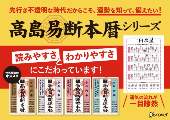 株式会社ディスカヴァー・トゥエンティワン(本社:東京都千代田区、取締役社長:谷口奈緒美)は2023年7月21日に『令和六年 高島易断本暦』『令和六年 高島易断開運本暦』『令和六年 高島易断運勢本暦』『令和六年 高島易断吉運本暦』(高島易断協同組合・著)を刊行しました。