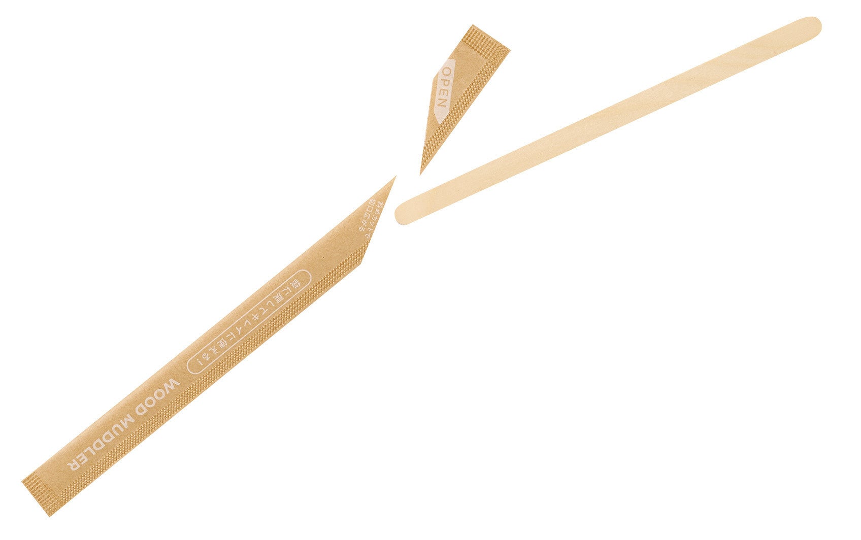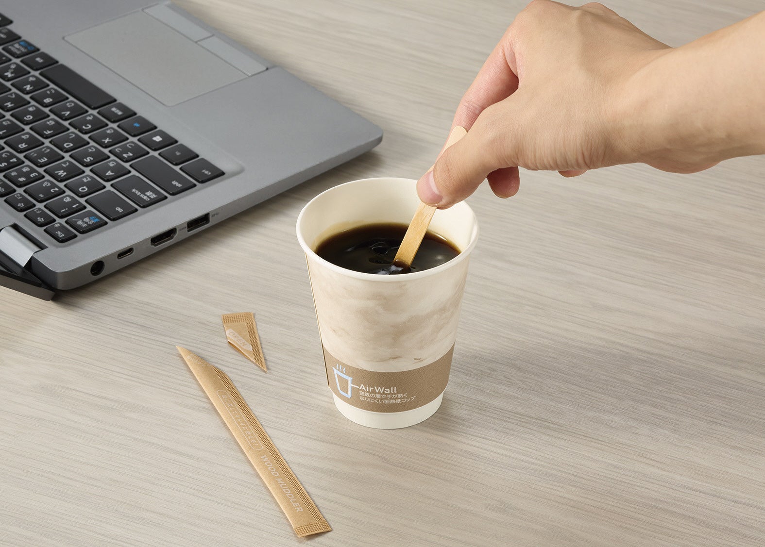 箱がそのままストックケースとして使用でき、マドラーの補充作業を軽減する木製マドラーです。個包装なので、来客時も衛生的に使えます。使用後のマドラーを袋に戻しやすいよう、切り口が広い斜めのカットデザインを採用。使用したマドラーを机に置いておきたいときにも、机を汚しにくく便利です。紙製個包装と木製マドラーのため、ゴミの分別が不要で片付けも簡単です。