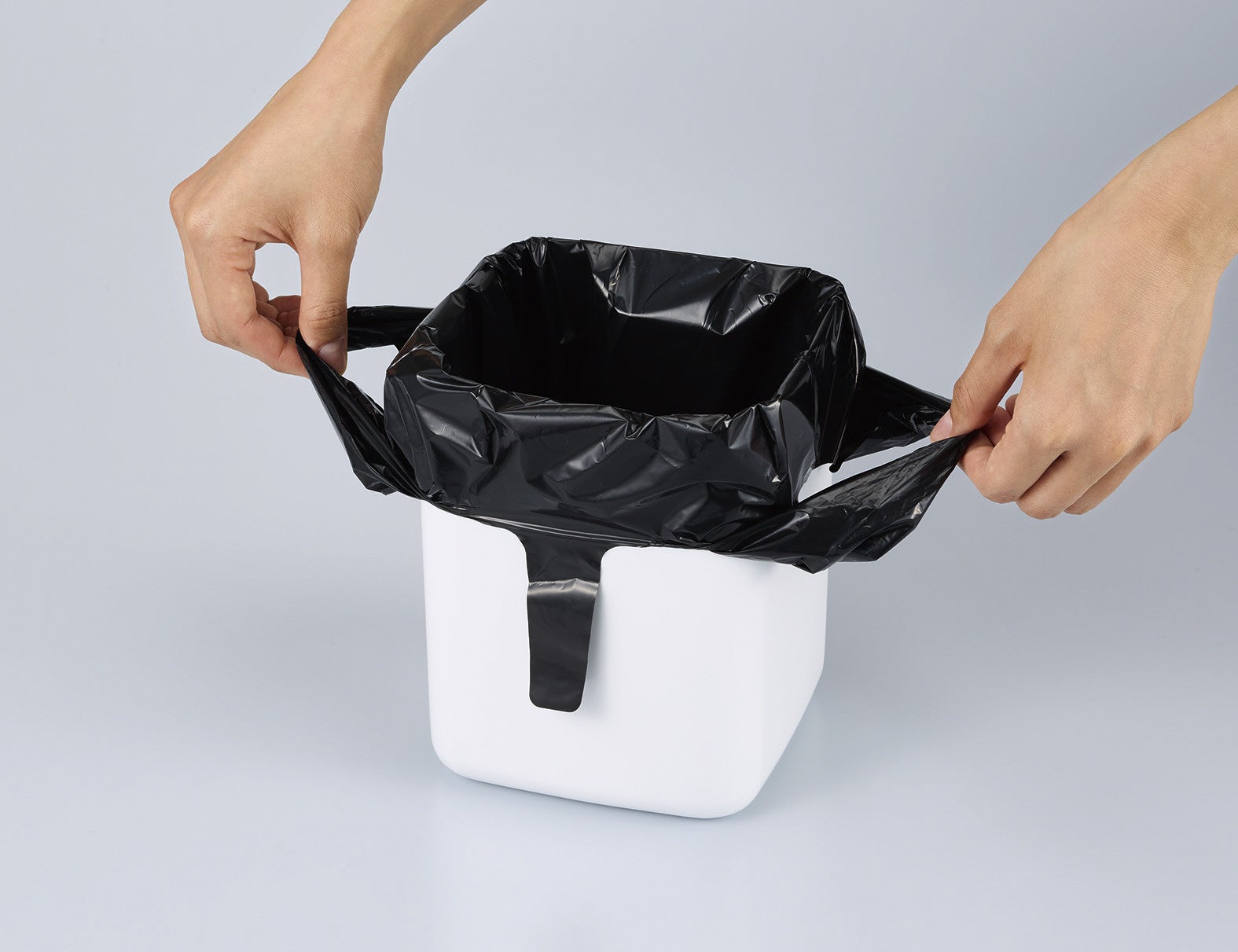 トイレの棚や引き出しに縦向き・横向きどちらでも設置できるので、限られた収納スペースでも場所を選ばず保管しやすいサニタリー袋です。厚さ0.025mmと厚手の低密度ポリエチレン製なので中身が透けにくく、消臭剤配合でニオイを軽減します。持ち手付きのため、中のサニタリーゴミに触れずに衛生的に処理できます。