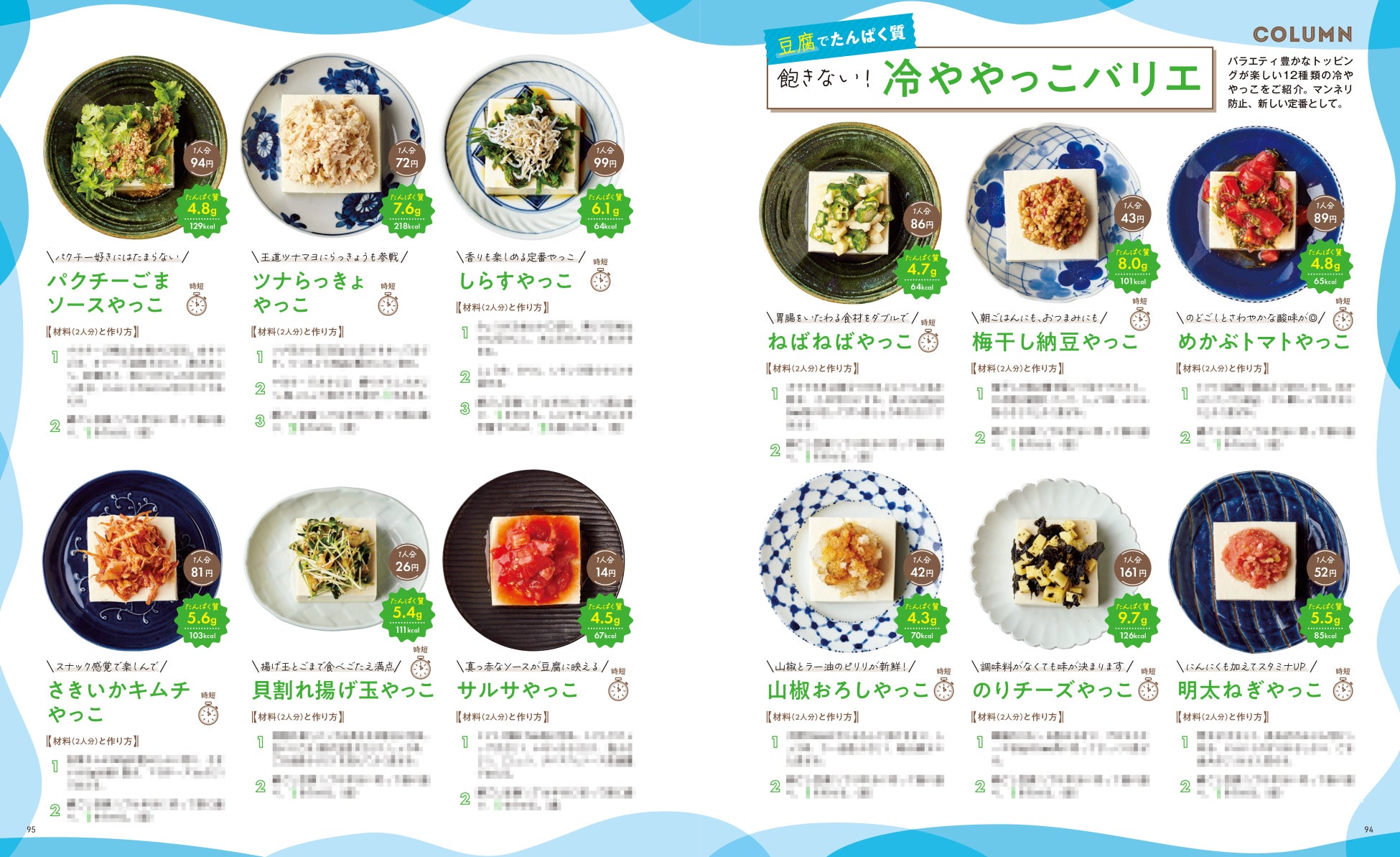 すべてのレシピでたんぱく質量、カロリー、材料費がひと目でわかるアイコンつき!