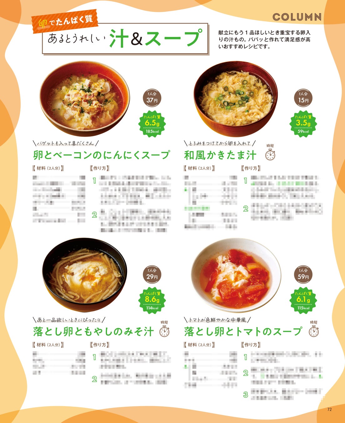 さらに、あと一品欲しい、少しボリュームを足したいというときに頼れる卵を使った汁ものレシピも掲載。短時間でパパッと作れて満足感が高いおすすめレシピです。