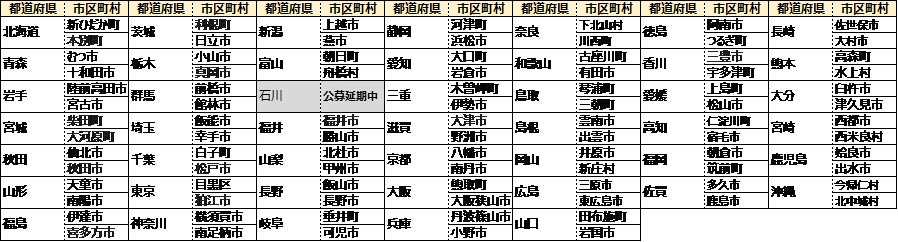 全国47都道府県からそれぞれ2自治体(市区町村)を選出しました。24年1月能登半島地震・24年9月豪雨災害の被害が大きかった石川県は、復興に向けた自治体業務の逼迫等を考慮し、公募と審査を延期しています。今後の状況を確認させていただきながら、適切な時期に公募を実施させていただきます。