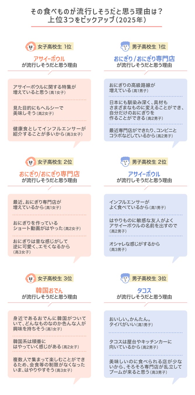 一方で、男子高校生では「おにぎり/おにぎり専門店」が2割強で1位になりました。2位は「アサイーボウル」、3位は「タコス」がそれぞれ1割強で続きました。