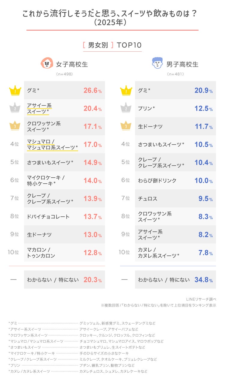 【LINEリサーチ】高校生がこれから流行りそうだと思うスイーツ・飲みものは 「グミ」、食べ物は「おにぎり/おにぎり専門店」が1位に!アサイー系は両方のランキングで上位に