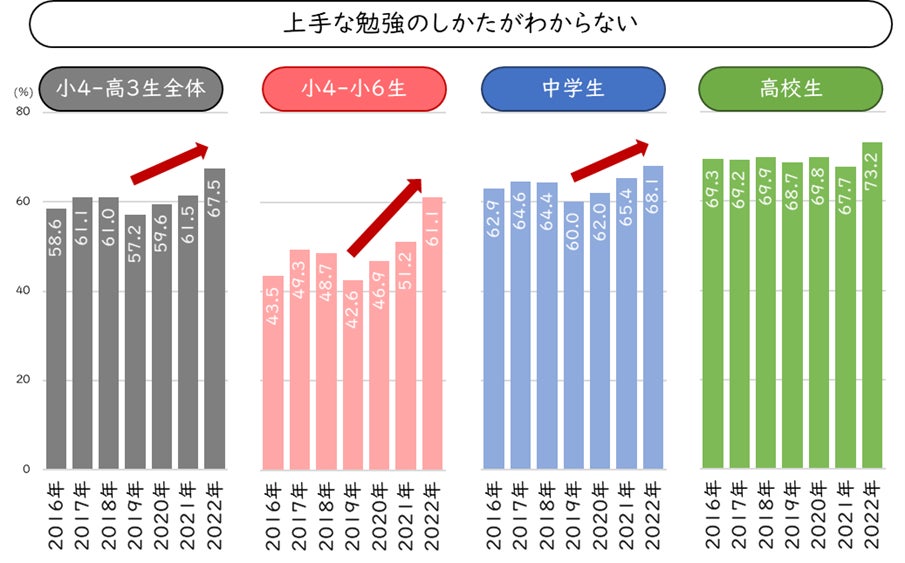 ●「上手な勉強のしかたがわからない」の肯定率(小学4年生から高校3年生までの全体の数値)は、19年(57.2%)→20年(59.6%)→21年(61.5%)→22年(67.5%)と、4年間で10.3ポイント上昇しました。学習方法に悩む子どもが増えています。