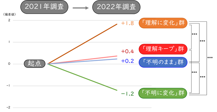 学習意欲の変化では、学習方法の「理解に変化」群で「意欲向上」群が多く出現する一方で、「不明に変化」群で「意欲低下」群が多く出現し、相互の変化が連動しています(図4)。学習方法を理解するようになると、学習意欲が向上しています。さらに、成績の変化では、「理解に変化」群の成績の伸びが顕著で、この群は他の群と有意に成績が向上していました(図5)。学習方法を理解することは、学習意欲のような意識に影響し、成績にも効果をもっています。