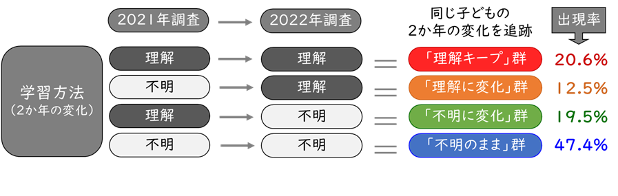 ◆「上手な勉強のしかたがわからない」の回答について同じ子どもの変化を2か年にわたり追跡したところ、2021年調査は「不明」から22年調査で「理解」になった「理解に変化」群が12.5%いました。