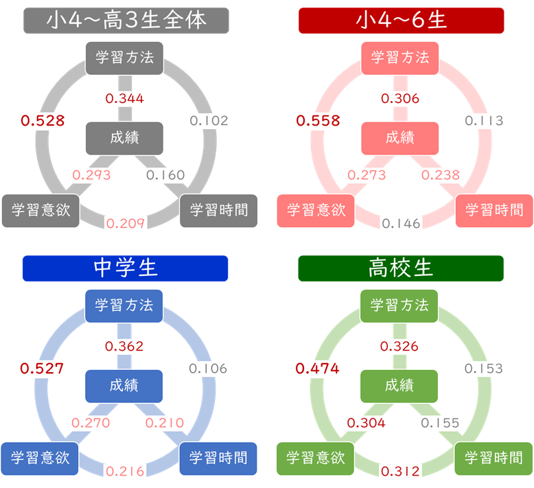 ●今回の分析では、「成績」にもっとも強い関連があったのは「学習方法」でした。これに「学習意欲」が続き、「学習時間」はかなり弱い相関しかみられませんでした。「学習時間」をやみくもに長くするよりも、「学習方法」を身につけるほうが成績向上に早道と言えそうです。このことは、いずれの学校段階でも同様です。