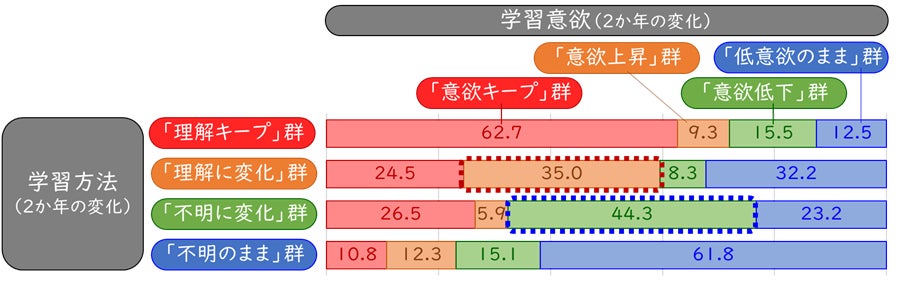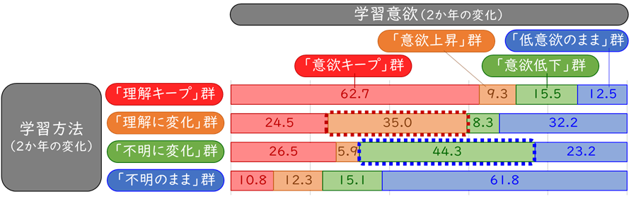 ●前年に学習方法を理解していなかったにもかかわらず翌年に理解に転じた「理解に変化」群には、「意欲上昇」群が多く出現しています。逆に学習方法を理解している状態からわからないに転じた「不明に変化」群には、「意欲低下」群が多い傾向がみられました。