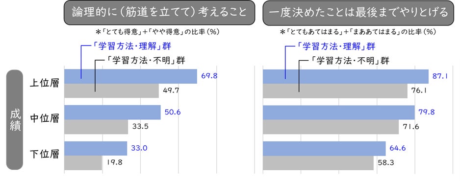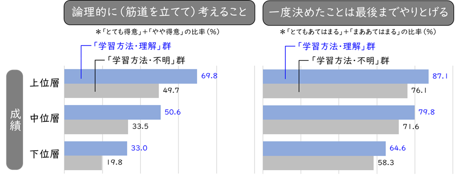 ●学習方法の理解は成績だけでなく、論理的に考える力や粘り強さのような多様な資質・能力とも関連しています。