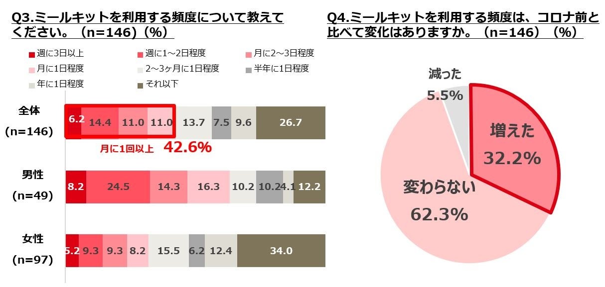 調理が簡単で、確かな味を楽しめる「ミールキット」。利用者は約15%とまだ少数派ですが、利用頻度がコロナ前より「増えた」との回答が30%を超え、コロナ禍をきっかけに、より身近な存在になったことが分かります。また、今後の意向を尋ねると、利用したい」「まあまあ利用したい」との回答が約半数あり、今後も利用増の可能性がうかがえる結果となりました。