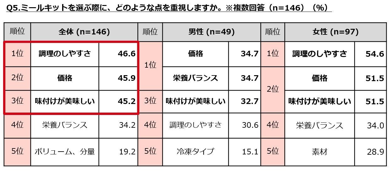 ・「調理のしやすさ」「価格」「味付けが美味しい」を重視。