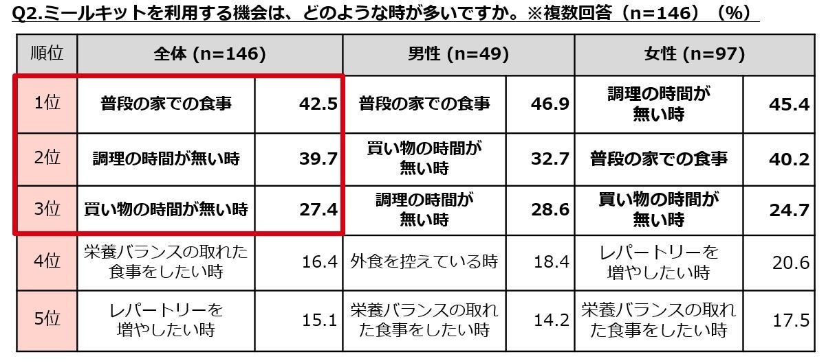 ・利用機会は「普段の家での食事」「調理の時間が無い時」「買い物の時間が無い時」がTOP3。