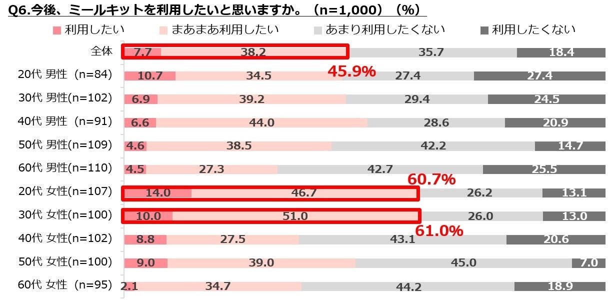 ・今後の利用意向は46%が「利用したい」、20~30代女性は60%を上回る。