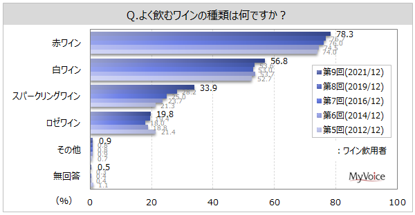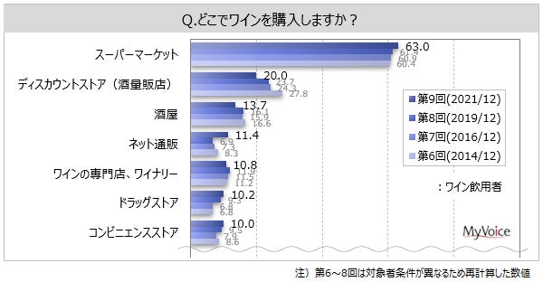 【ワインに関する調査】よく飲むワインの種類は「スパークリングワイン」が増加傾向、女性で比率高い。ワイン飲用者の購入場所は「スーパーマーケット」が6割強、「ディスカウントストア」が2割