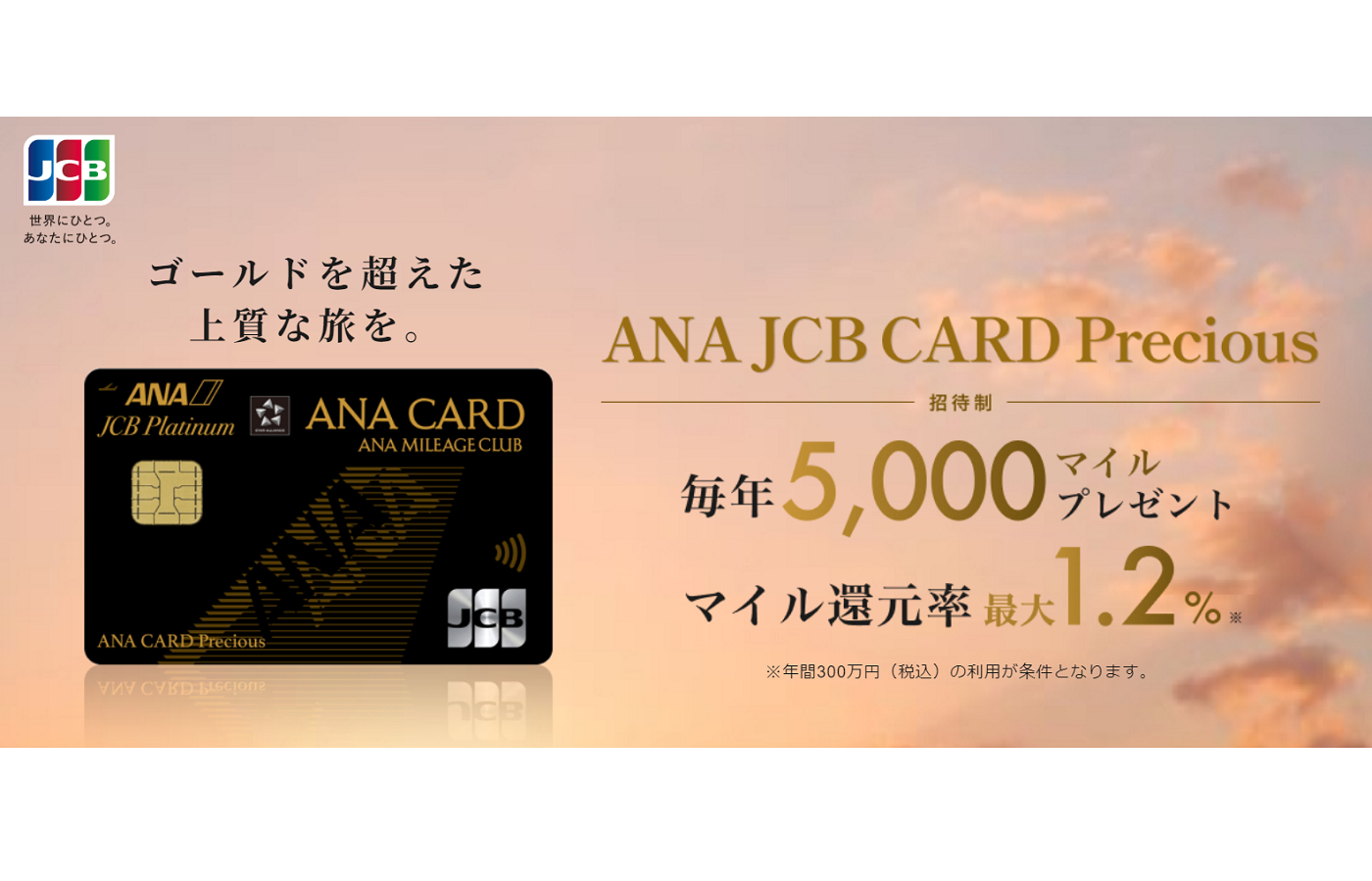「ANA JCB CARD Precious」は、選ばれた人だけが持てるゴールドカードより更に上質な招待制カードです。2025年1月末時点でANA JCBワイドゴールドをお持ちの方で、ショッピングご利用合計金額が300万円(税込)※以上の方を対象にご招待DMをお送りいたします。