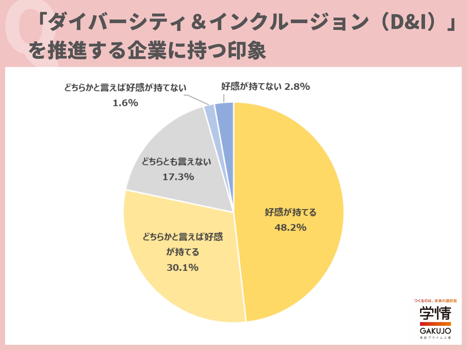 「ダイバーシティ&インクルージョン(D&I)」を推進する企業に持つ印象について、「好感が持てる」と回答した学生が48.2%に上りました。「どちらかと言えば好感が持てる」30.1%を合わせると、8割に迫る学生が、「ダイバーシティ&インクルージョン」を推進する企業は好感が持てるとしています。