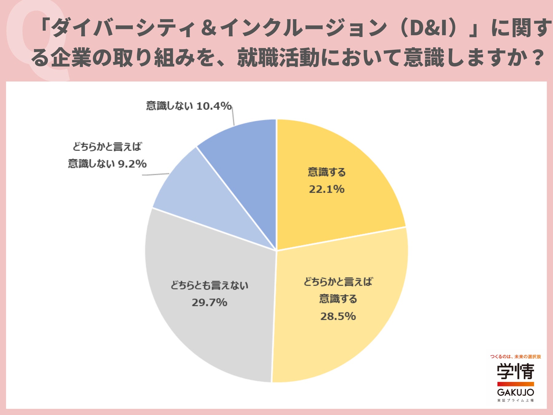 「ダイバーシティ&インクルージョン」に関する企業の取り組みを、「意識する」と回答した学生が22.1%に上りました。「どちらかと言えば意識する」28.5%を合わせると、半数以上の学生が、就職活動において「ダイバーシティ&インクルージョン」に関する企業の取り組みを意識していることが分かります。「これからの時代、必要な考え方だと思う」「多様性を大切にしている企業のほうが、成長していくと思う」「様々な価値観を持つ人と一緒に仕事をするほうが、自分自身の視野も広がると思う」といった声が上がりました。