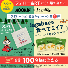 「ムーミン」とのコラボレーションを記念して、SNSキャンペーンを実施します。カルビー公式アカウント(@calbee_PR)をフォローの上、当該投稿をリツイートした方の中から抽選で計250名様に「ムーミンの日2023限定トートバッグ」と「Jagabee」をプレゼントします。