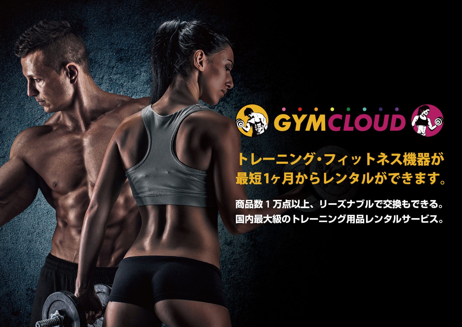 「GYM CLOUD(ジムクラウド)」は、国内最大のトレーニング機器、フィットネス用品、格闘技用品等のレンタルサービスです。業務用トレーニングマシンから安価なホームジムマシン、グローブやサンドバックなどの格闘技用品、フィットネスバイクやバランスボール、プロテインやサプリメントに至るまで、幅広いトレーニング機器商品のレンタル・定期便を行っています。