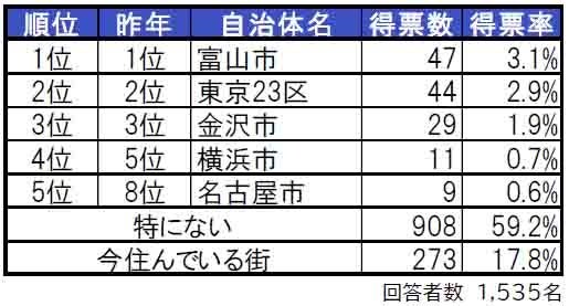 住みたい街1位は3年連続で富山市。2位と3位は2年連続で東京23区、金沢市。