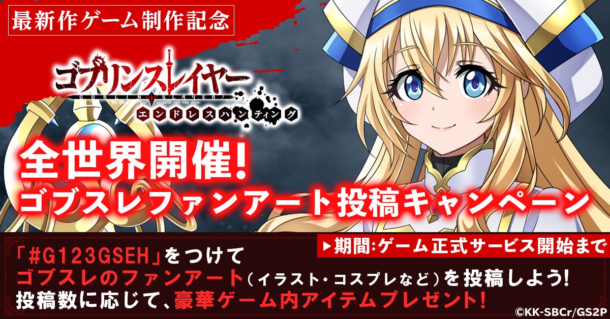 9月15日より、全世界で、ゴブスレファンアート投稿キャンペーンを開催いたします。ファンアートの投稿数に応じて、ゲームリリース時の報酬が豪華になります!コスプレ画像やグッズのコレクション、自分で描いたイラストなど、ゴブリンスレイヤーに関する画像があれば、ご参加可能です。多数のご参加お待ちしております。