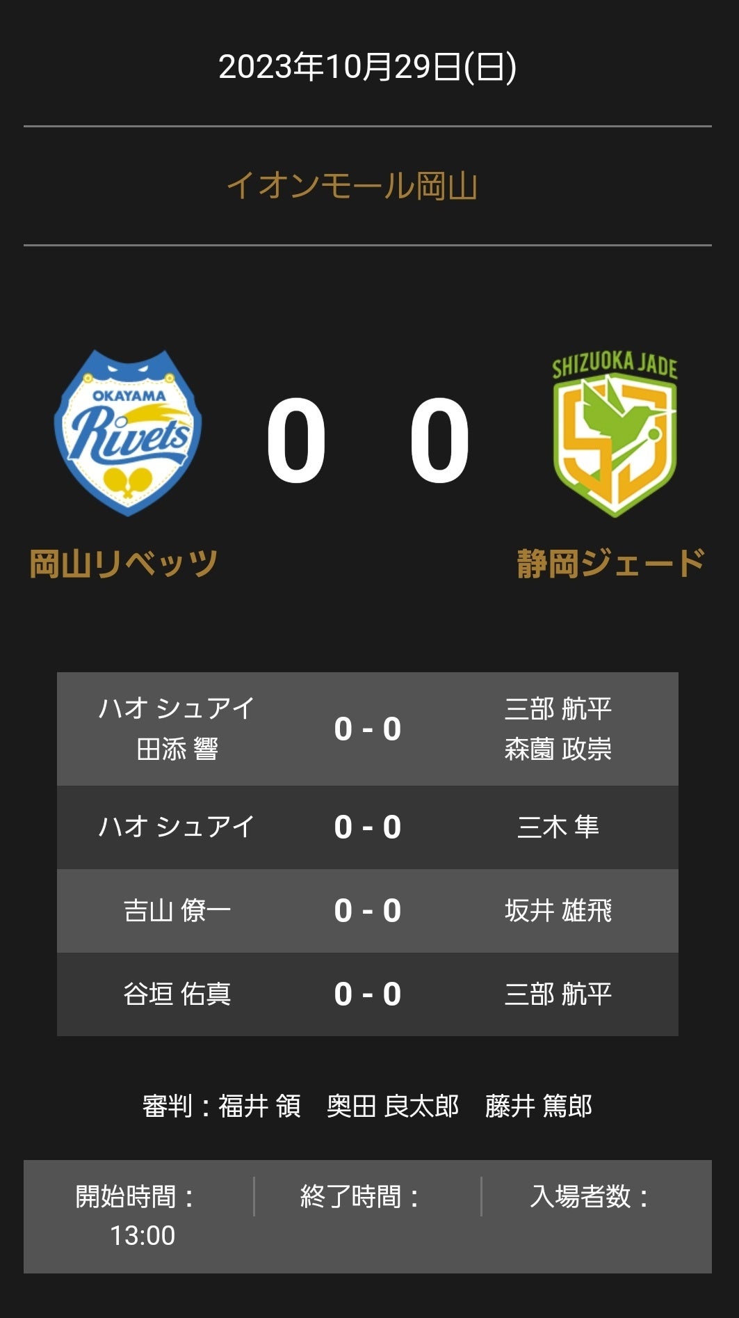 ノジマTリーグ 2023-2024シーズン 公式戦 10月29日開催 岡山リベッツ vs 静岡ジェード 対戦オーダー発表