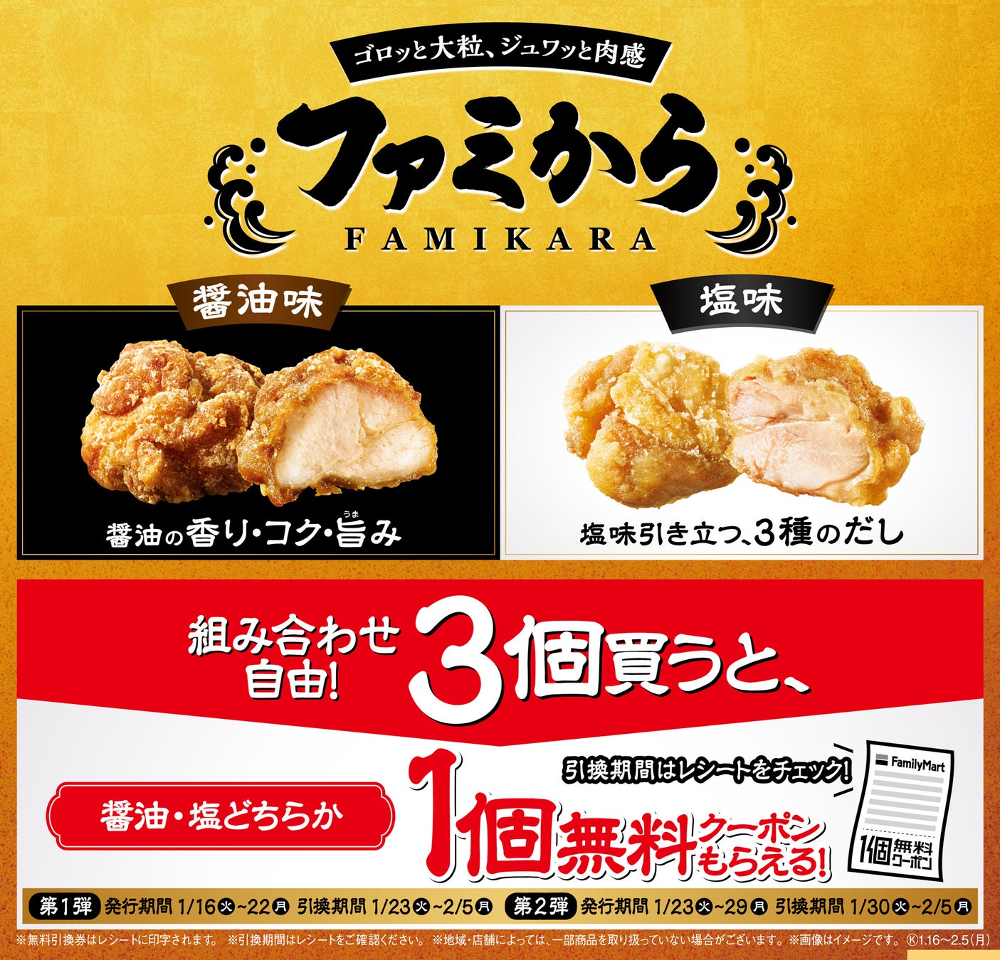 ゴロッと大粒、ジュワッと肉感の「ファミから」発売から累計1億2,500万食突破!3個買うと1個無料クーポンもらえるキャンペーンを1月16日(火)から開催~あなたの住まいの都道府県は醤油派?塩派?~