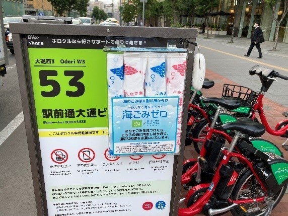 街をきれいにし続ければ海はもっともっと美しくなる!CHANGE FOR THE BLUE in北海道とシェアサイクル「ポロクル」連携企画!札幌市内のシェアサイクルポートにごみ袋ケースを設置