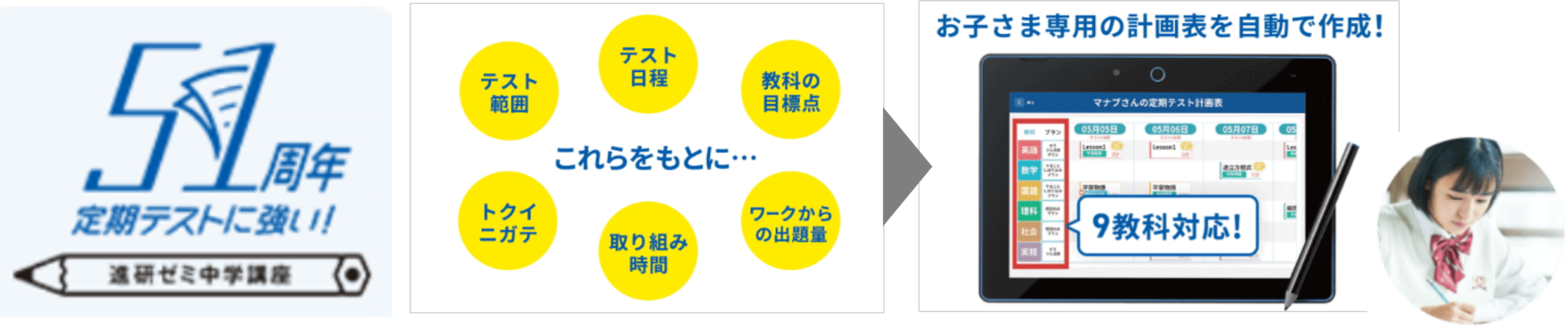 「進研ゼミ中学講座」は、一人ひとりのテスト日程や目標、取り組み時間に合わせて、専用の学習プランを自動で生成。「上手な勉強の仕方がわからない」と感じるお子さまでも迷うことなく学習に取り組める講座設計。自分のペースで学びながらも、1回1回のテストの本番で確実に結果を出し、志望校合格につなげられる教材にこだわり続けています。
