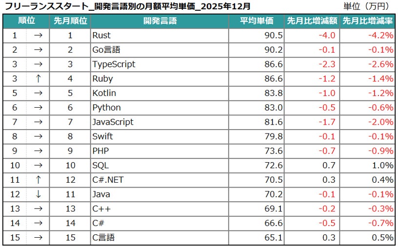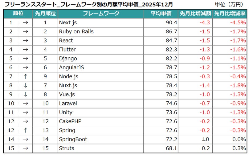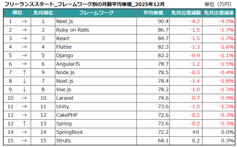 エン株式会社(本社:東京都新宿区、代表取締役会長兼社長:越智通勝)が運営するフリーランスエンジニア向け案件検索エンジン『フリーランススタート』(https://freelance-start.com/)では、サイトに掲載されたすべての求人の情報を集計し、分析を行なっています。2025年12月度の集計結果がまとまりましたので、お知らせします。