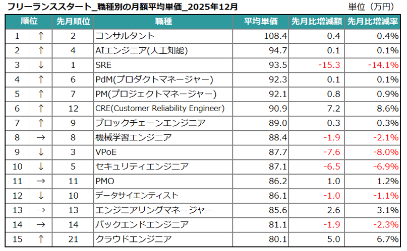 職種別の月額平均単価(上位15位)を見ると、高い専門性を持つ職種において順位の変動が見られました。なかでも「SRE」は93.5万円(-15.3万円/14.1%減)となり、9~11月にかけて首位を維持していた高水準から順位を下げ、数ヵ月前の水準へ回帰しています。一時的に高まっていた需要が落ち着き、体制や役割の見直しが進んでいることがうかがえます。