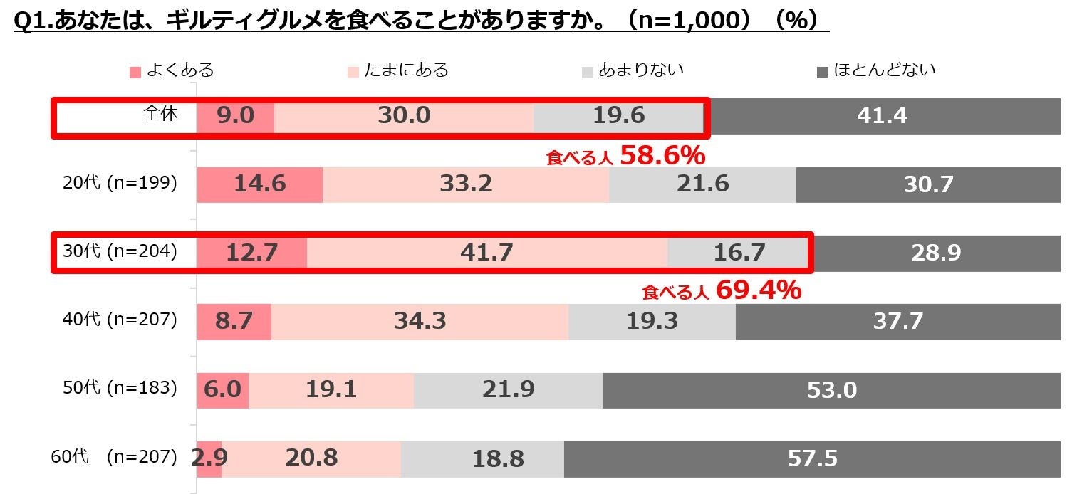 ・「ギルティグルメ」を食べる人は約60%。年代の差が大きく、30代では約70%。