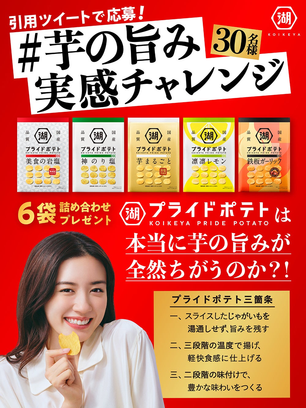 老舗・湖池屋の技によって引き出される“芋の旨み”が、本当に他のポテトチップスとは違うのか。みなさまに実感して、そのご感想をいただきたいとの想いから、食べた感想をTwitterでご投稿していただいた方に「湖池屋プライドポテト」の詰め合わせをプレゼントするキャンペーンを実施します。