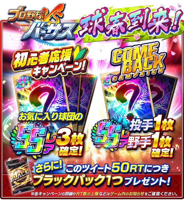期間中に「プロ野球バーサス公式Twitterアカウント(@Versus1GP)」の該当ツイートのリツイート数に応じて「ブラックパック」を最大10パック、プレゼントします。