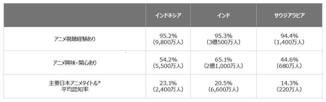 コンテンツを起点とした広告やビジネス設計の支援を行う専門チームである「コンテンツビジネスラボ」の協力のもと、今後コンテンツ市場の伸長が見込まれるインドネシア、インド、サウジアラビアの3カ国で「日本アニメ利用ポテンシャル層(※)」を対象として、日本のアニメタイトルに対する認知・嗜好・消費行動を調査・分析。その結果、3カ国すべてにおいて「子供から大人まで楽しめる一般的な娯楽」として浸透しつつも、各国でアニメの嗜好性には違いがみられることが分かりました。また、現状では日本の主要アニメタイトルの平均認知率は2割前後と市場拡大に向けてまだまだポテンシャルがあることも明らかになりました。