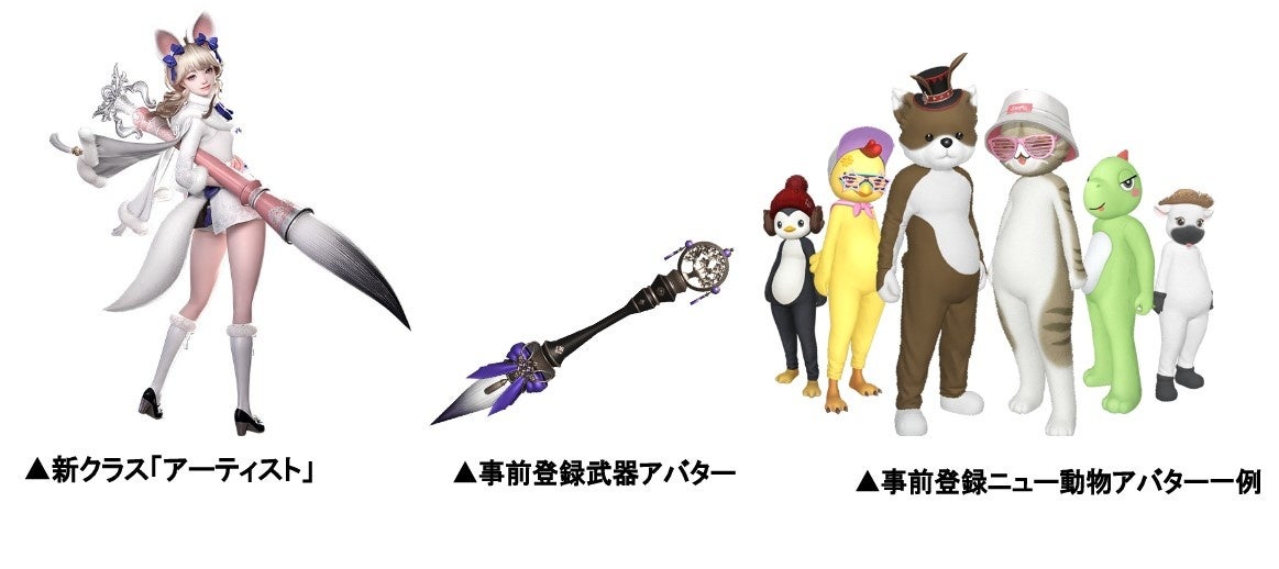 事前登録を行っていただいた方全員に、「アーティスト」専用武器アバターや称号、今回初登場となるアバターが含まれた「ニュー動物アバター選択箱」、戦闘を有利に進められる「バトルアイテム総合箱」、「レア職業専用刻印書選択箱」などをプレゼントいたします。