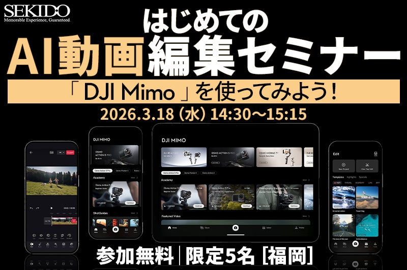 DJI(ディージェイアイ)正規販売代理店としてドローンや映像制作機器を取り扱う株式会社セキド(本社:東京都港区、代表取締役:大下貴之)は、セキド福岡(運営:株式会社レイメイセキド)と共催で、2026年3月18日(水)に福岡市で、動画編集初心者向けの無料セミナー「はじめてのAI動画編集セミナー『DJI Mimo』を使ってみよう!」を開催いたします。