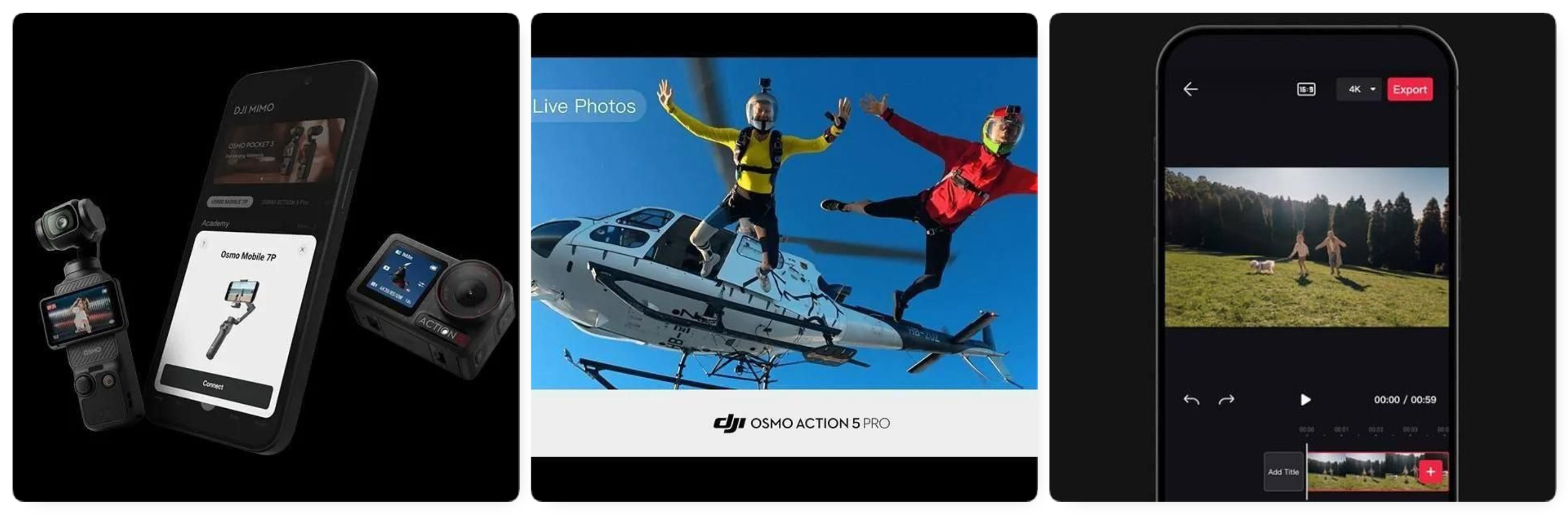 DJI Mimo(ディージェイアイ ミモ)は、OsmoシリーズなどのDJIハンドヘルド機器と連携し、撮影から編集・共有までをスマホ1台で完結できるアプリです。撮影時のHDライブビューやインテリジェント撮影モードに加え、テンプレートや編集機能を使って手軽に仕上げられるのが特長です。