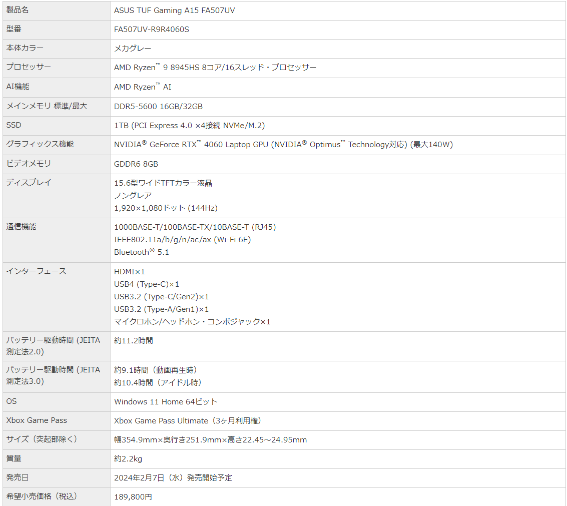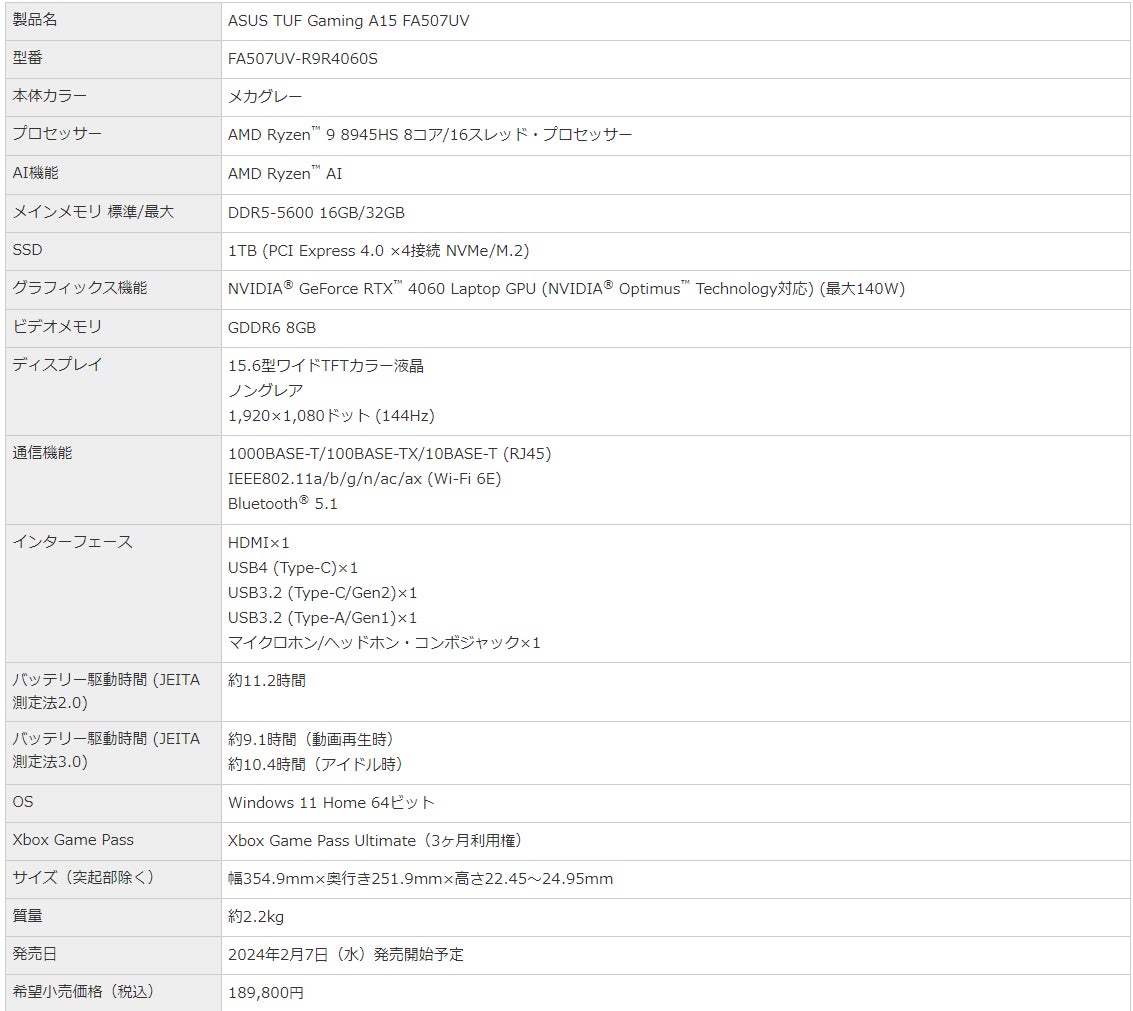 ASUS TUF Gaming A16 FA607:https://www.asus.com/jp/laptops/for-gaming/tuf-gaming/asus-tuf-gaming-a16-2024/