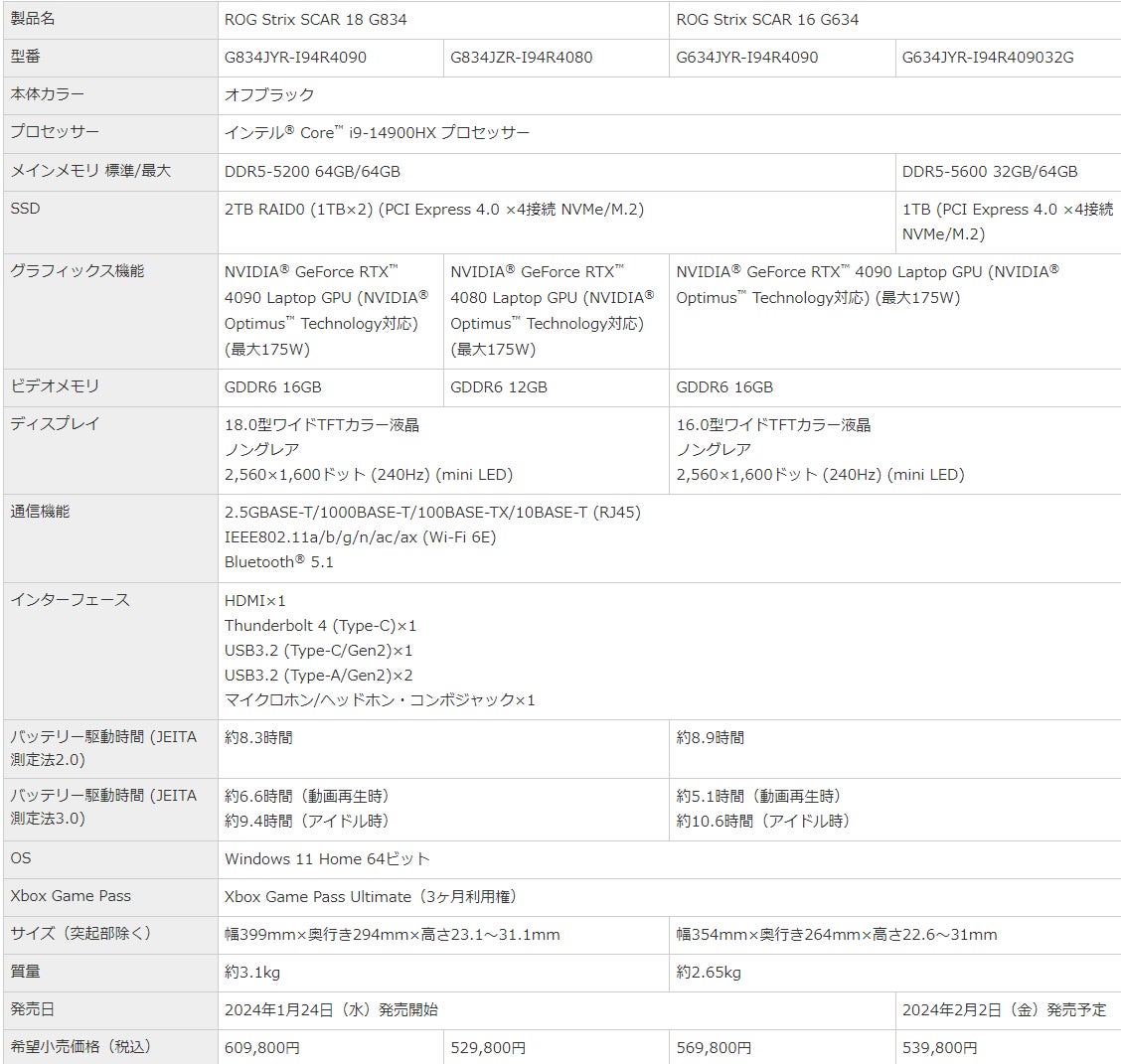 ROG Strix SCAR 16 G634:https://rog.asus.com/jp/laptops/rog-strix/rog-strix-scar-16-2024/