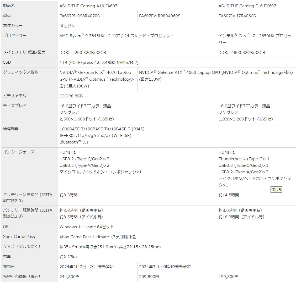 ASUS TUF Gaming F16 FX607:https://www.asus.com/jp/laptops/for-gaming/tuf-gaming/asus-tuf-gaming-f16-2024/