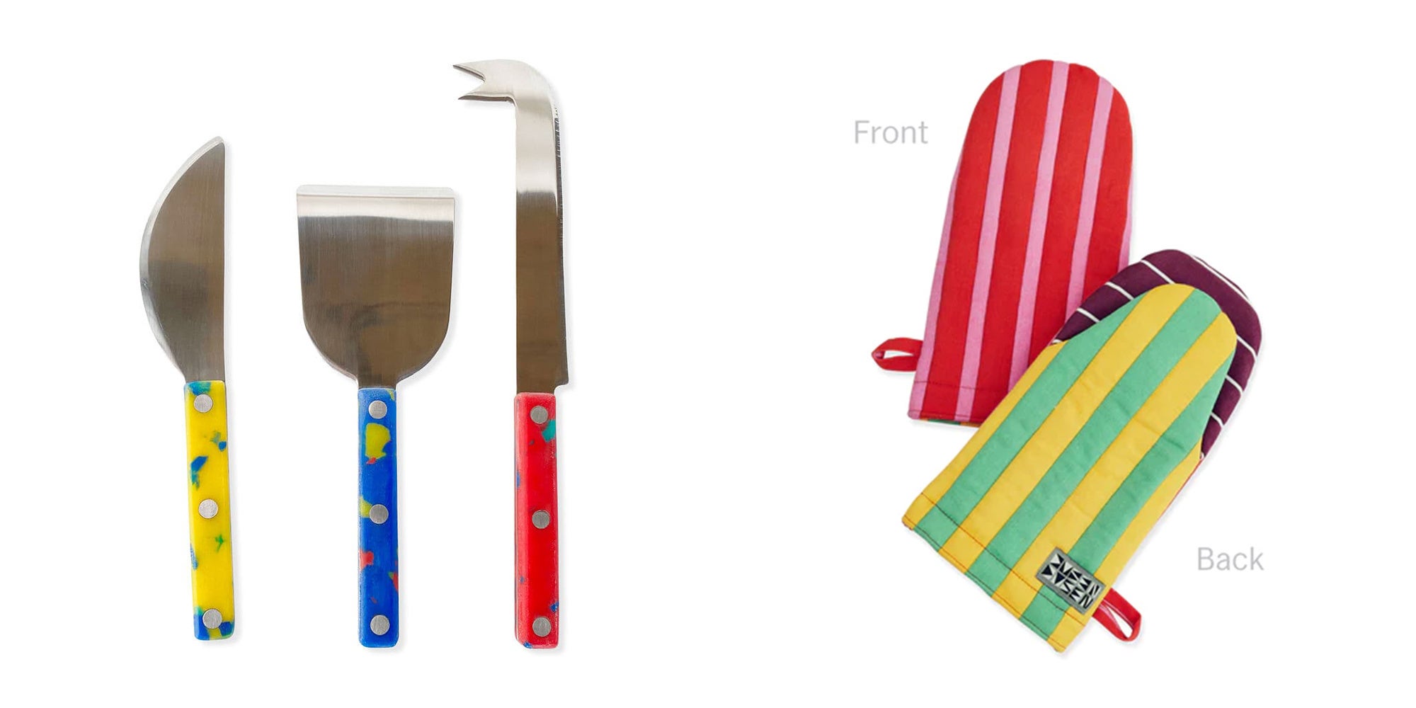 ブルックリンにあるスタジオ「Fredericks & Mae(フレデリックス&メイ)」から届いたこのチーズナイフセットは、紙吹雪模様のカラフルなハンドルが食卓を華やかにしてくれます。