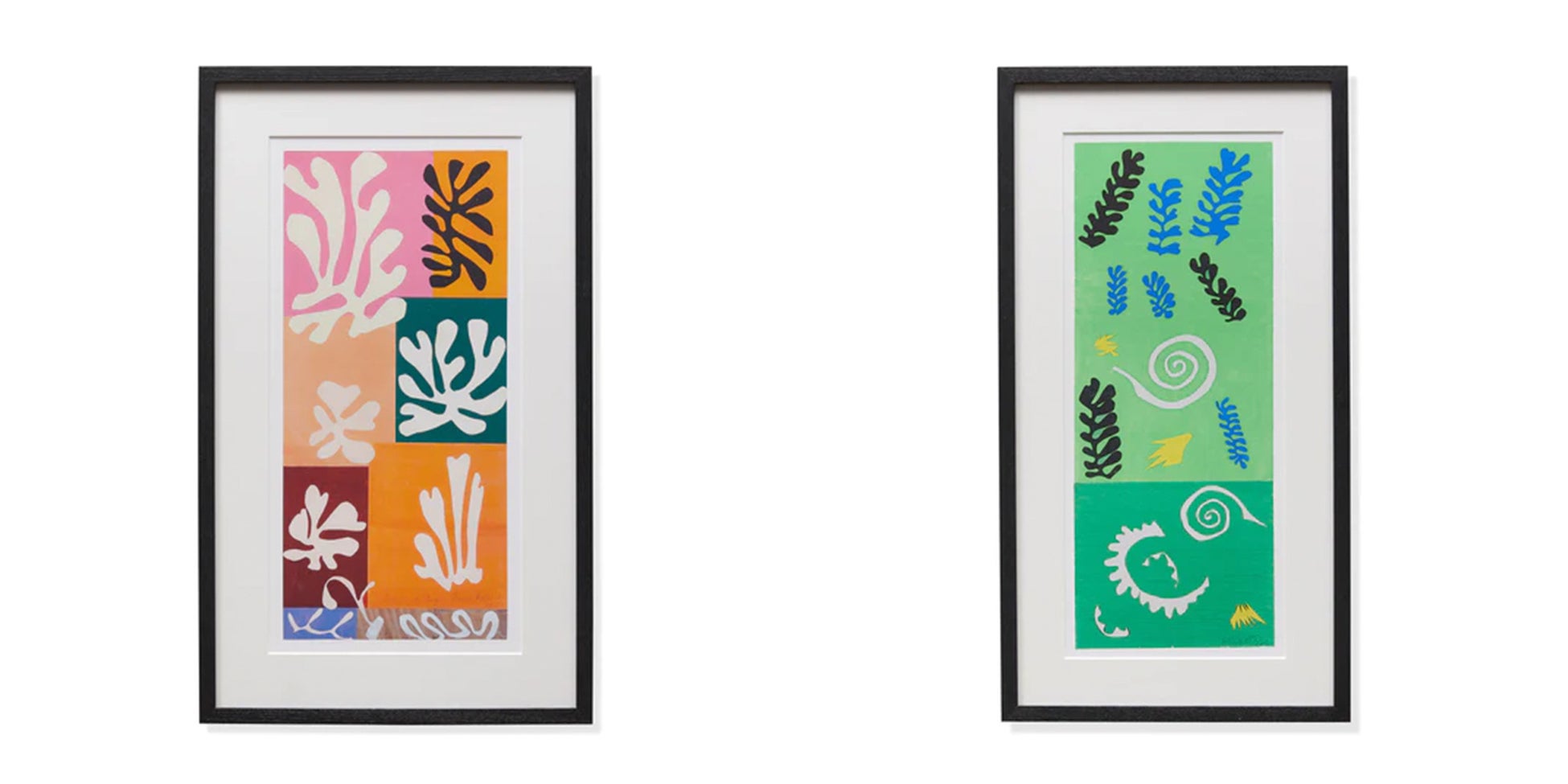 MoMA収蔵アーティストのアンリ・マ ティスの作品『Snow Flowers (1951) 』(※左) と『Composition on a Green Ground (1974) 』(※右) の複製画です。サステナブルな森林で育ったブラックアッシュのフレームに収められています。