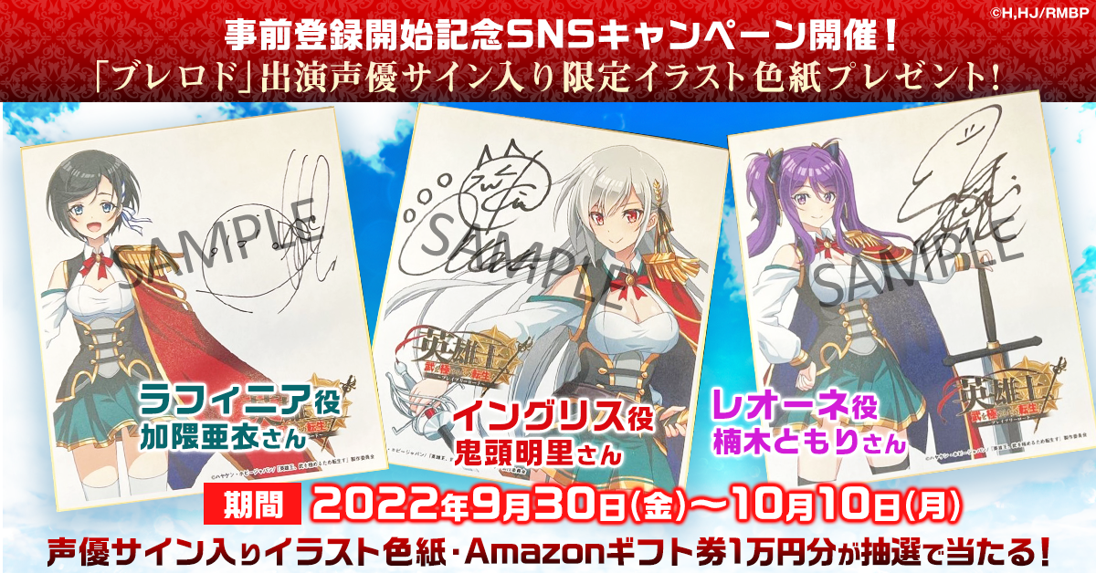 ゲームの事前登録開始を記念して、「ブレロド」公式Twitter内にてフォロー&RTキャンペーンを開催中です。参加者の中から抽選で、イングリス役の鬼頭明里さん、ラフィニア役の加隈亜衣さん、レオーネ役楠木ともりさんのサイン入り色紙やAmazonギフト券1万円分が当たります。サイン色紙は、ブレロドに登場するキャラクターイラスト入りのプレミアムな色紙となっておりますので、ぜひご参加ください。